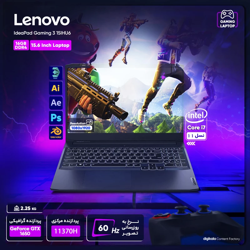 لنوو با سری Ideapad Gaming گزینههایی مقرون به صرفه و در عین حال قدرتمند برای بودجههای مختلف فراهم میکند. لپتاپ IdeaPad Gaming ۳ ۱۵IHU۶ یکی از این گزینههاست که ضمن برخورداری از سختافزار مناسب برای اجرای بازیهای جدید، قیمت قابل قبولی هم دارد. وزن ۲.۲۵ کیلوگرم برای یک لپتاپ در این ابعاد و رده کاربری کاملا معقول بوده و نمیتوان ایرادی از آن گرفت. بدنه اصلی از طراحی ساده و خطوط ظریفی بهره میبرد که ظاهر شیکی به این لپتاپ میدهند. صفحهنمایش ۱۵.۶ اینچی رزولوشن Full HD یا به عبارت دیگر ۱۹۲۰ در ۱۰۸۰ داشته و تا ۲۵۰ نیت روشن میشود. نرخ بهروزرسانی ۶۰ هرتزی با توجه به سخت افزار استفاده شده مناسب به نظر میرسد. به لطف پردازنده Core i۷ مدل ۱۱۳۷۰H که از ۴ هسته و ۸ رشته پردازشی برخوردار است، کمتر مشکلی در بخش پردازشی در پیش خواهید داشت. دامنه فرکانس ۳.۳ تا ۴.۷ گیگاهرتز و ۱۲ مگابایت حافظه کش از دیگر ویژگیهای این پردازنده نسل ۱۱ اینتل هستند. ۱۶ گیگابایت حافظه DDR۴ با سرعت ۳۲۰۰ مگاهرتز برای تضمین تجربه روان و بدون لگ برای این مدل در نظر گرفته شده که با وجود یک اسلات خالی روی بورد، به راحتی قابل ارتقا خواهد بود. ۵۱۲ گیگابایت حافظه SSD پرسرعت از نوع NVMe M.۲ با کمی مدیریت کافی خواهد بود؛ هرچند که این بخش هم مانند رم در صورت نیاز کاربر قابل ارتقا خواهد بود. بخش اصلی مورد نظر گیمرها، پردازنده گرافیکی است که لنوو در این مدل از Geforce GTX ۱۶۵۰ با چهار گیگابایت حافظه اختصاصی استفاده کرده است. این پردازنده انویدیا قادر به اجرای بازیهای روز با تنظیمات قابل قبول و نرخ فریم مناسب خواهد بود. بلندگوهای Nahimic، باتری با ظرفیت ۴۵ وات ساعتی و نور پس زمینه کیبورد از ویژگیهای مهم IdeaPad Gaming ۳ ۱۵IHU۶ هستند.